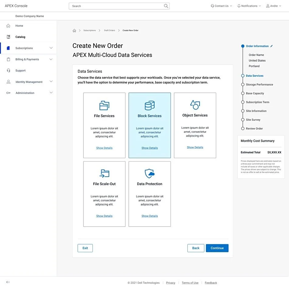Scope: Build a commerce/procurement console for the Dell APEX line of cloud compute and storage offers.
